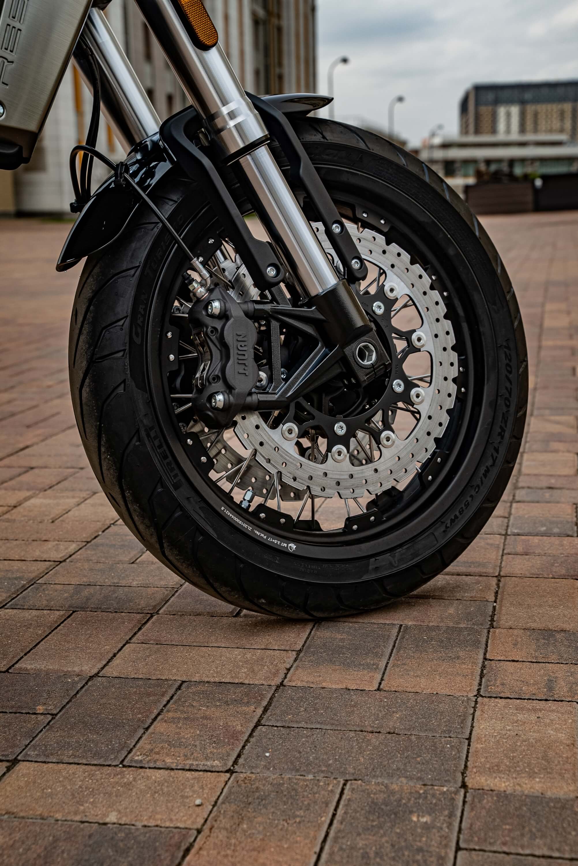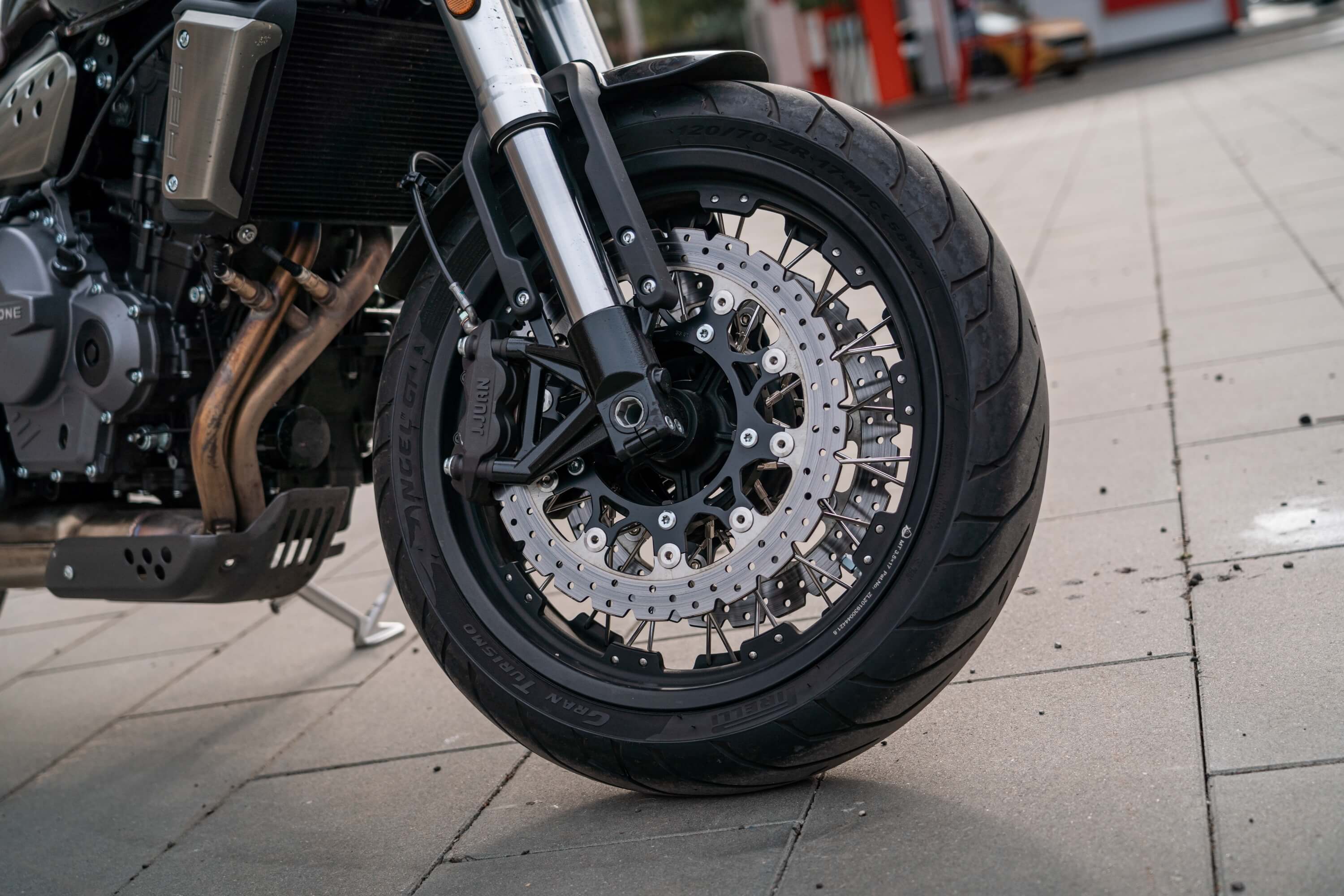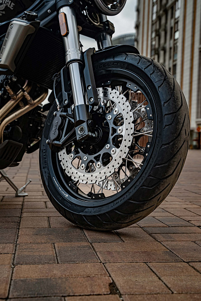 Мотоцикл оснащён классическими спицевыми колёсами диаметром 17 дюймов. Колёса обуты в бескамерные покрышки от легендарной фирмы PIRELLI. С неровностями дороги эффективно справляются телескопическая вилка перевёрнутого типа спереди и маятник с моноамортизатором сзади. Ход передней подвески составляет 120 мм, задней – 50 мм. Оба компонента подвески являются регулируемыми. Эффективное и безопасное замедление с любых скоростей обеспечивают гидравлические дисковые тормоза с ABS спереди и сзади. Тормозные системы произведены известной испанской фирмой J.JUAN (входящей в легендарный холдинг BREMBO).