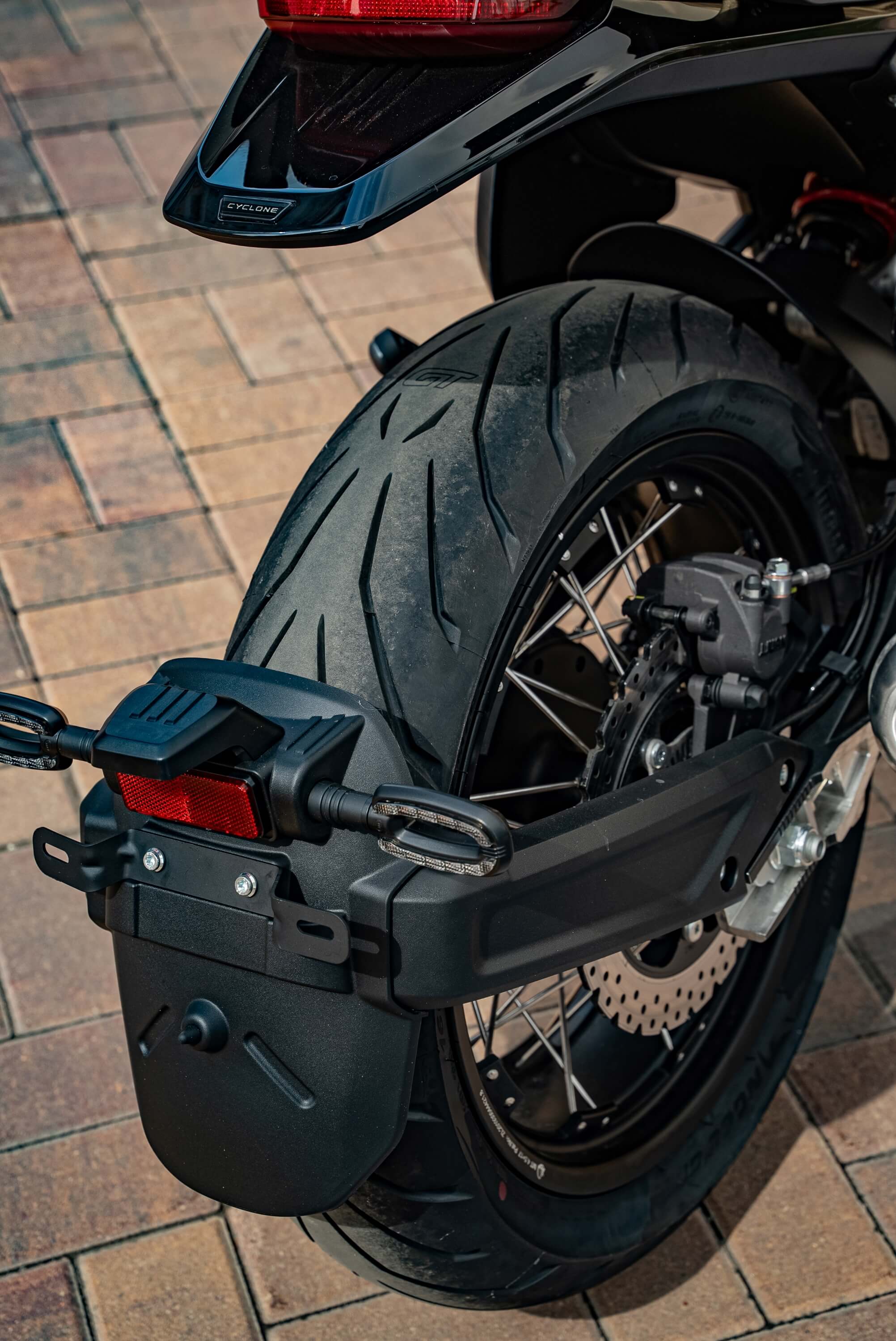 На мотоцикл установлены классические спицованные колёса диаметром 17 дюймов.